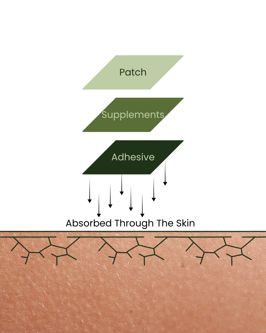 You apply the patch on a veinous area—such as the forearm, and the nutrients. (vitamins, supplements, or herbs) are transported from the patch to your body through the skin.